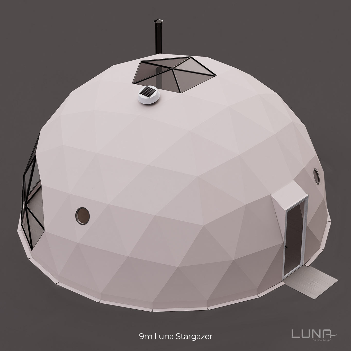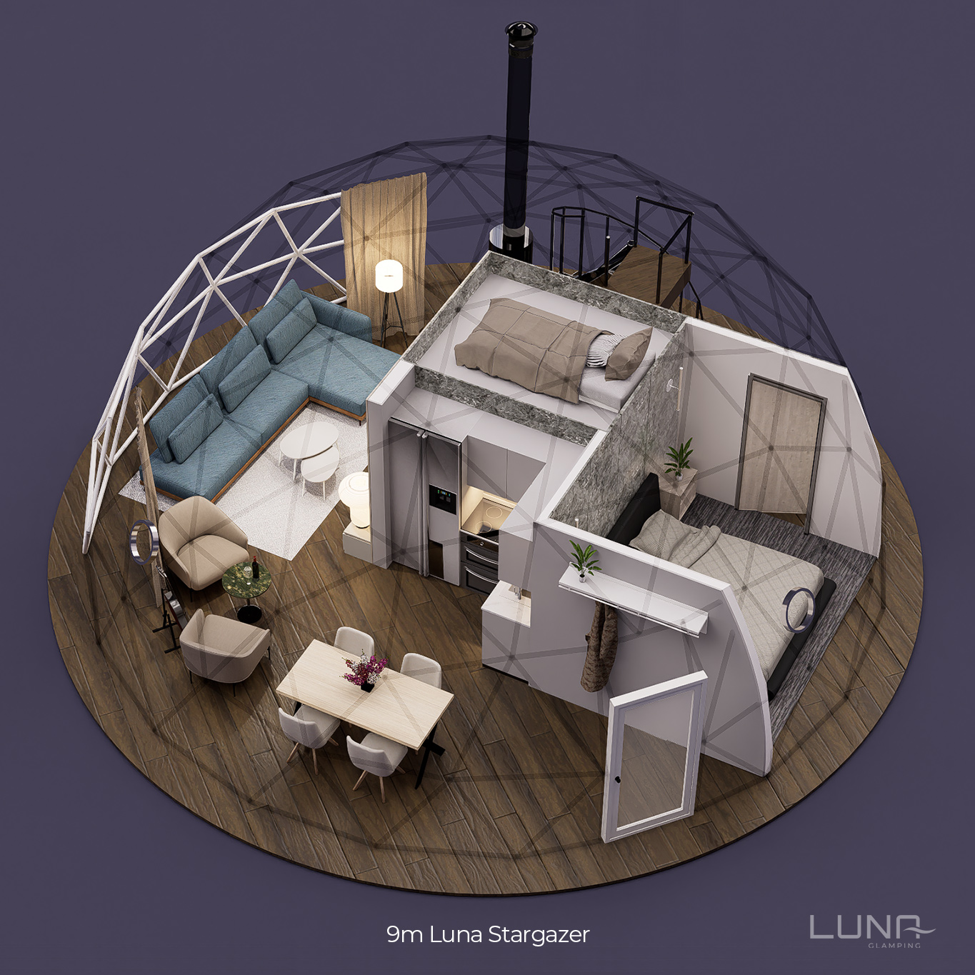Our 9m Deluxe Dome: 685 sq ft of luxurious glamping magic—panoramic stargazing roof, customizable kitchenette, bath, and serene living space. Pure wonder.